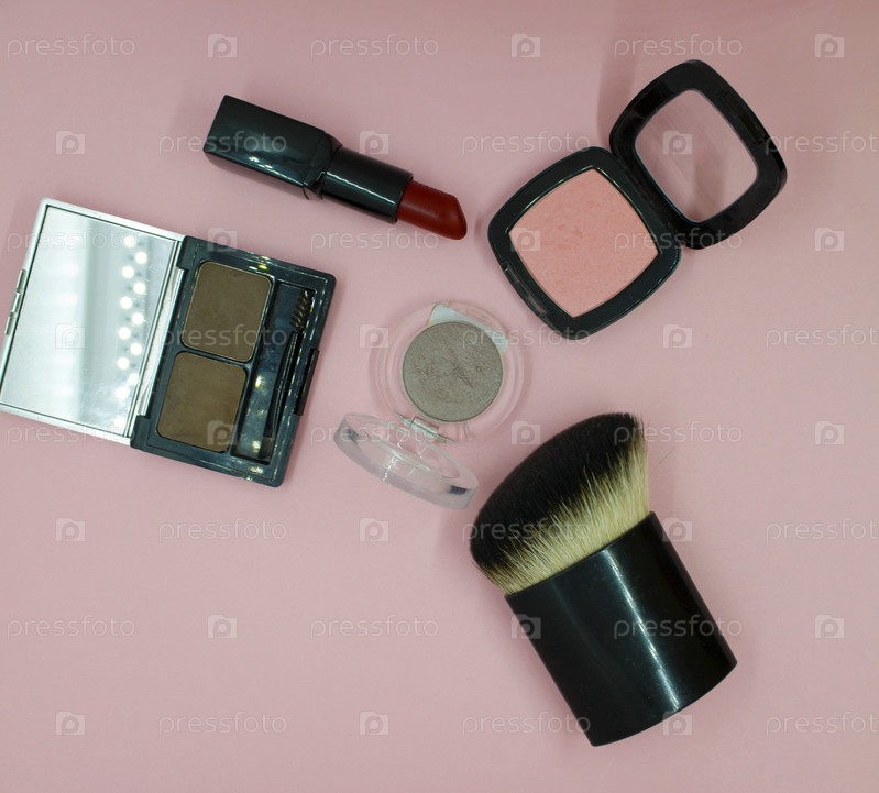 Косметическая кисть, румяна, красная помада и тени для век