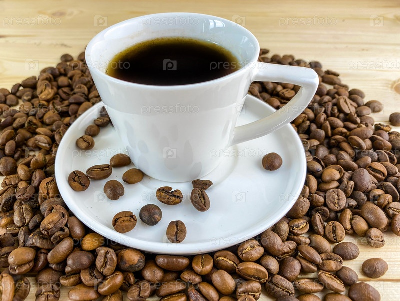 Кофе в чашке с блюдцем и кофейными зернами на деревянном столе