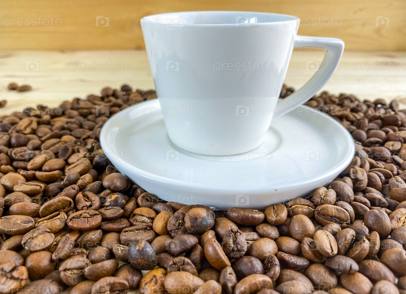 Кофе в чашке с блюдцем и зернами кофе на столе