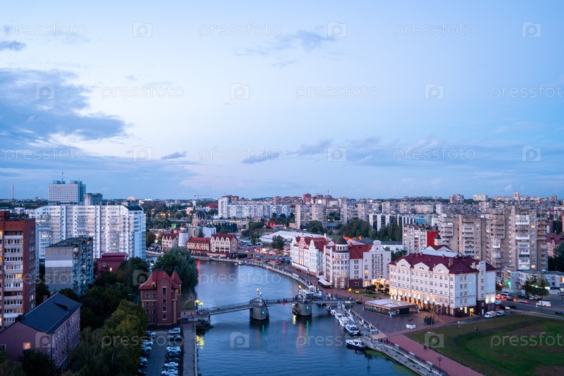 Вечером зажигаются огни города Калининграда. Россия