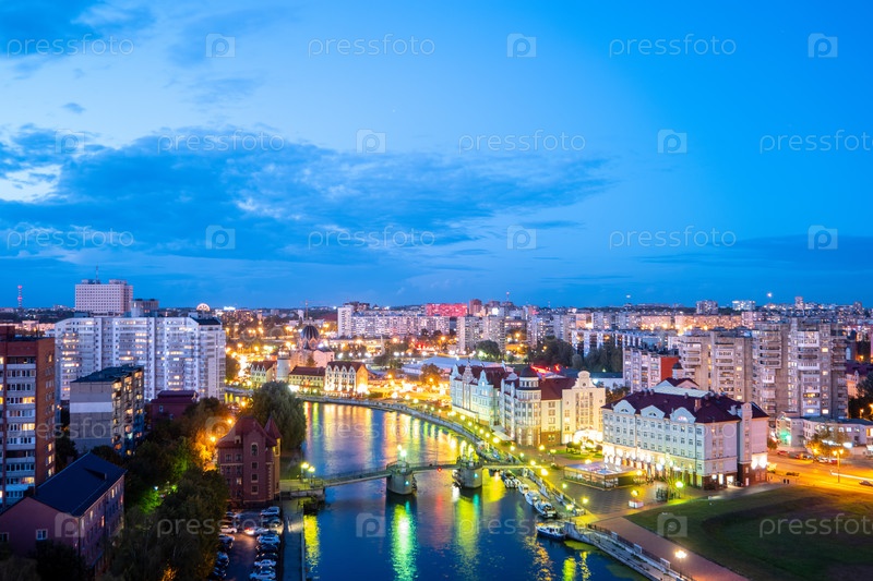 Вечером зажигаются огни города Калининграда. Россия
