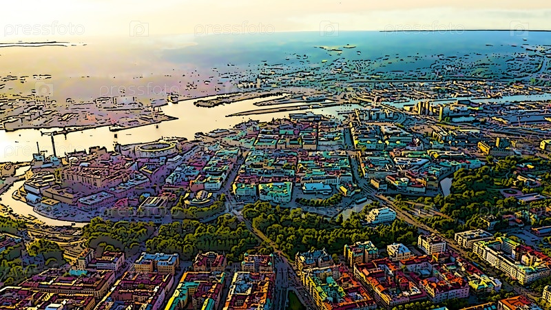 Гетеборг, Швеция. Панорама города и реки Гоэта Эльв. Исторический центр города. Закат. Яркая иллюстрация в мультяшном стиле. С высоты птичьего полета