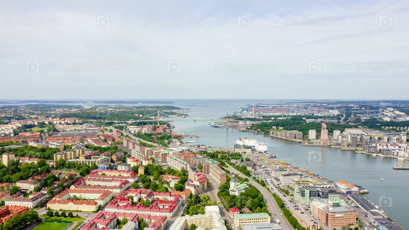 Гетеборг, Швеция. Альвсборгский мост. (Эльвсборгсбрунн) Панорама центральной части города. Пасмурная погода, С дрона