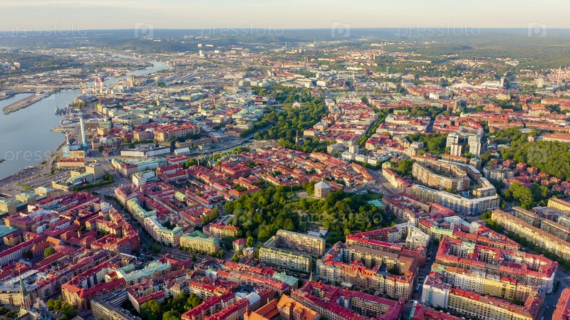 Гетеборг, Швеция. Панорама города и реки Гоэта Эльв. Исторический центр города. Закат, С Дрона