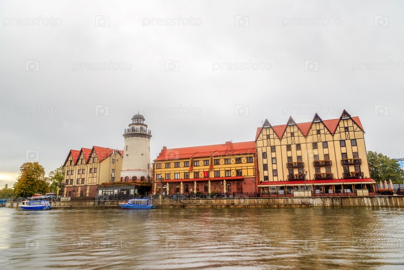 Россия, Калининград - 24 сентября 2018 г.: Центральная часть города Калининград, набережная Рыбной деревни. Дождливая погода