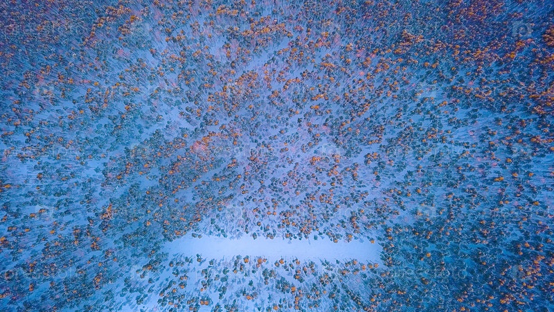Спуск с высоты над зимним лесом. Зима, ясная погода. Время заката, С дрона, СЪЕМКА ГОЛОВЫ