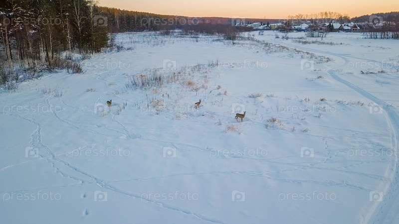 На озере пасутся дикие косули. Рядом с деревней. Время заката Зимняя ясная погода, От дрона