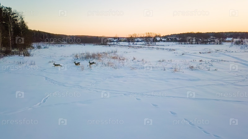 Дикие косули пасутся на озере, а потом убегают в лес. Рядом с деревней. Время заката Зимняя ясная погода, От дрона