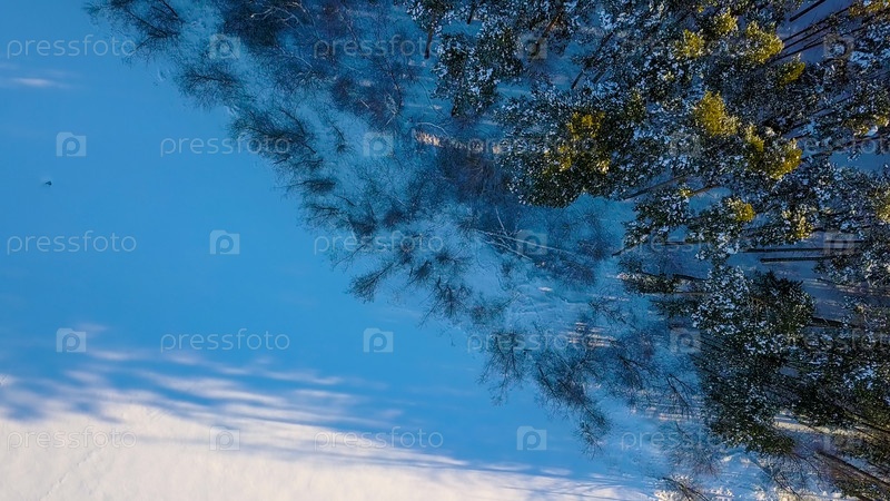 Опушка соснового леса на берегу замерзшего озера. Зима, ясная погода, с дрона, СЪЕМКА ГОЛОВЫ