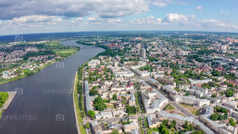 Панорама города Твери, Россия. С высоты птичьего полета. Река Волга, С Дрона