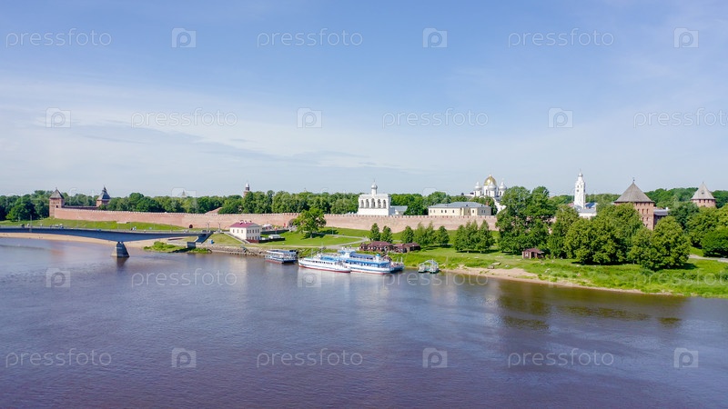 Великий Новгород, Россия. Новгородский Кремль (Детинец), река Волхов. Полет над городом, С дрона