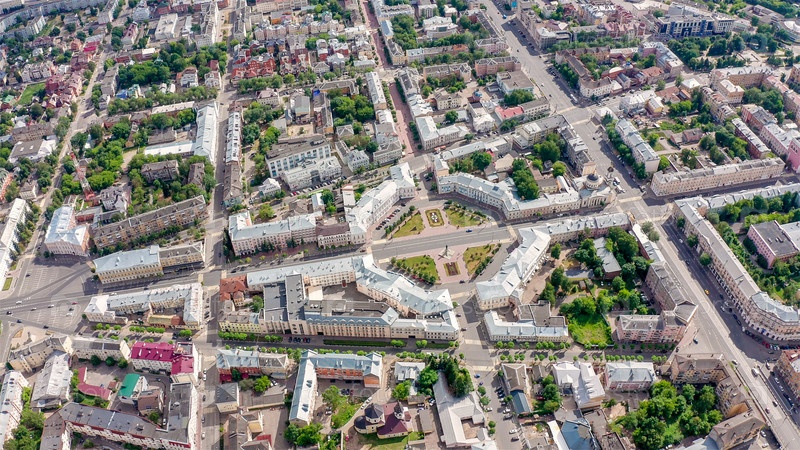 Панорама города Твери, Россия. С высоты птичьего полета. Площадь Ленина, с дрона