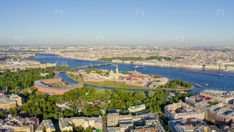 Россия, Санкт-Петербург. Река Нева. Панорамный вид с воздуха на Заячий остров и остров Артелери. Петропавловская крепость. Троицкий мост, От дрона