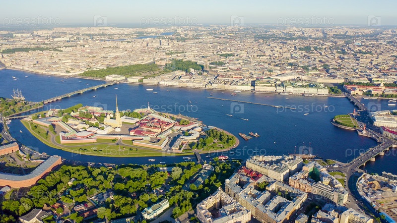 Россия, Санкт-Петербург. Река Нева. Панорамный вид с воздуха на Заячий остров и остров Артелери. Петропавловская крепость. Троицкий мост. Стрелка Васильевского острова, с дрона