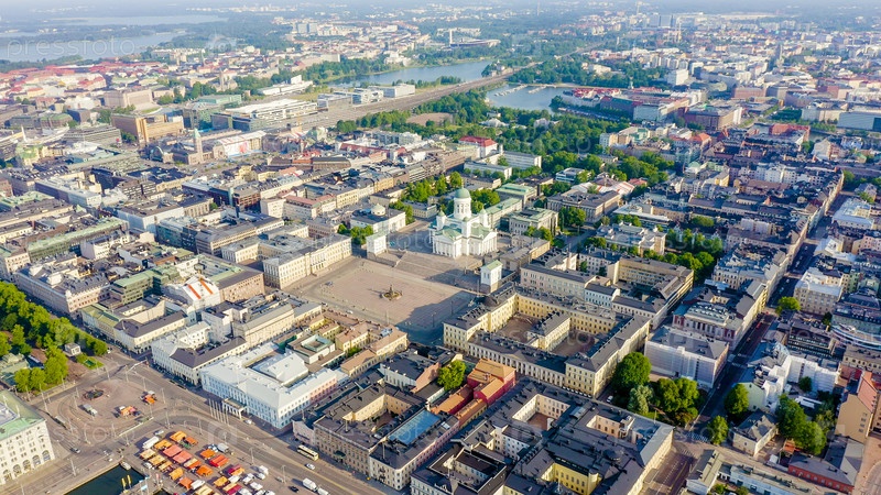 Хельсинки, Финляндия. Вид с воздуха на центр города. Хельсинкский собор. Сенатская площадь. Рыночная площадь, от дрона