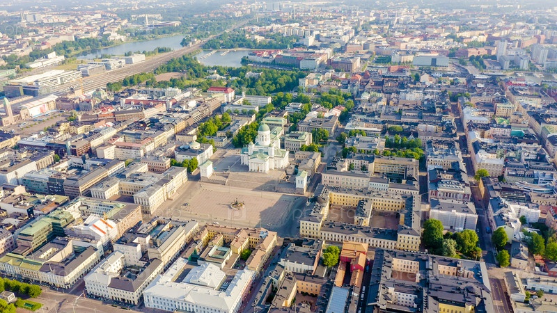 Хельсинки, Финляндия. Вид с воздуха на центр города. Хельсинкский собор. Сенатская площадь. Рыночная площадь, от дрона