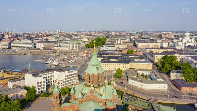 Хельсинки, Финляндия. Вид с воздуха на центр города. Успенский собор, с дрона
