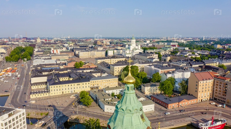 Хельсинки, Финляндия. Вид с воздуха на центр города. Успенский собор, с дрона