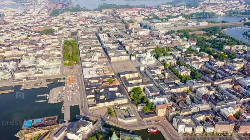 Хельсинки, Финляндия. Вид с воздуха на центр города. Хельсинкский собор. Сенатская площадь. Рыночная площадь, от дрона