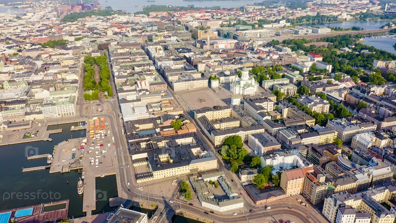 Хельсинки, Финляндия. Вид с воздуха на центр города. Хельсинкский собор. Сенатская площадь. Рыночная площадь, от дрона