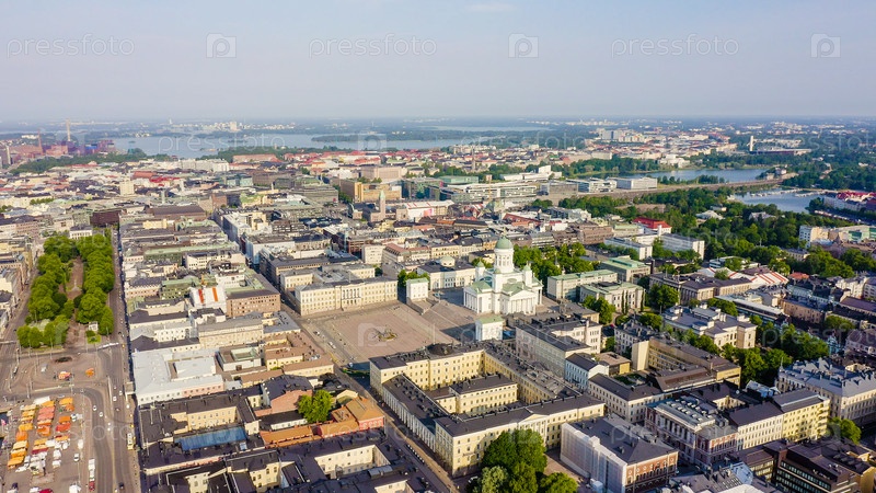 Хельсинки, Финляндия. Вид с воздуха на центр города. Хельсинкский собор. Сенатская площадь. Рыночная площадь, от дрона