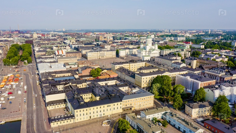 Хельсинки, Финляндия. Вид с воздуха на центр города. Хельсинкский собор. Сенатская площадь. Рыночная площадь, от дрона
