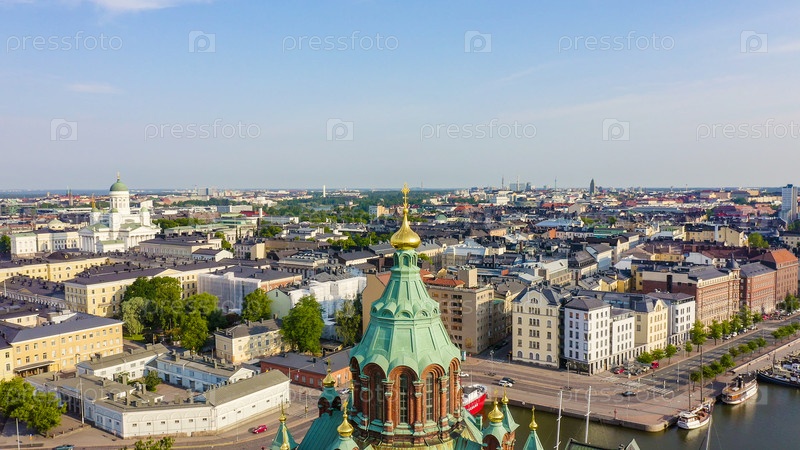 Хельсинки, Финляндия. Вид с воздуха на центр города. Успенский собор, с дрона