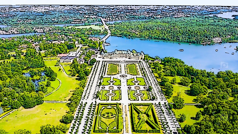 Стокгольм, Швеция. Хорошо сохранившаяся королевская резиденция с садами. Яркая иллюстрация в мультяшном стиле. С высоты птичьего полета