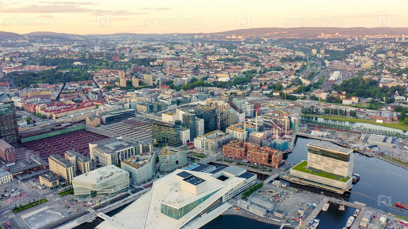 Осло, Норвегия. Панорамный вид на центр города во время заката. Железнодорожный вокзал, От дрона