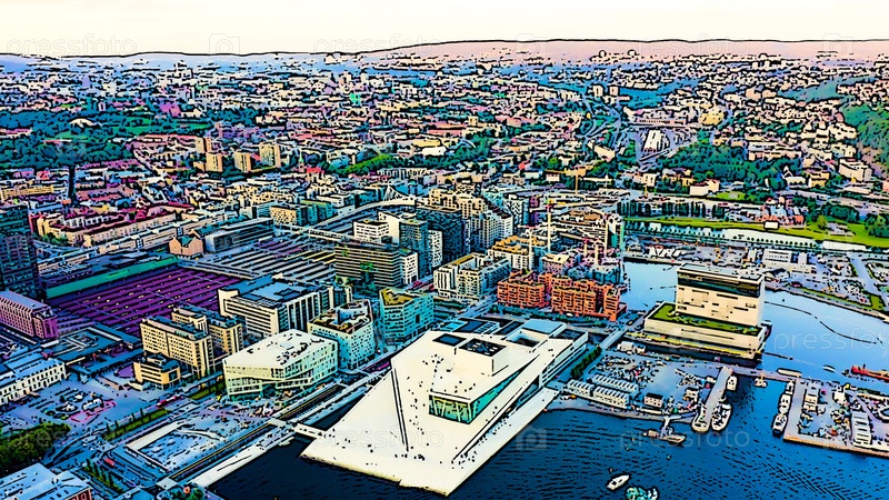 Осло, Норвегия. Центральная часть города. Время заката. Яркая иллюстрация в мультяшном стиле. С высоты птичьего полета
