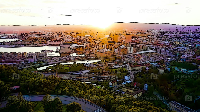 Осло, Норвегия. Центральная часть города. Время заката. Яркая иллюстрация в мультяшном стиле. С высоты птичьего полета
