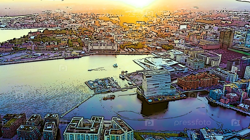 Осло, Норвегия. Центральная часть города. Время заката. Яркая иллюстрация в мультяшном стиле. С высоты птичьего полета