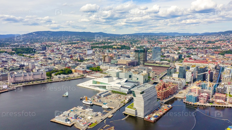 Осло, Норвегия. Центр города с воздуха. Набережная Осло-фьорда. Оперный театр Осло, с дрона