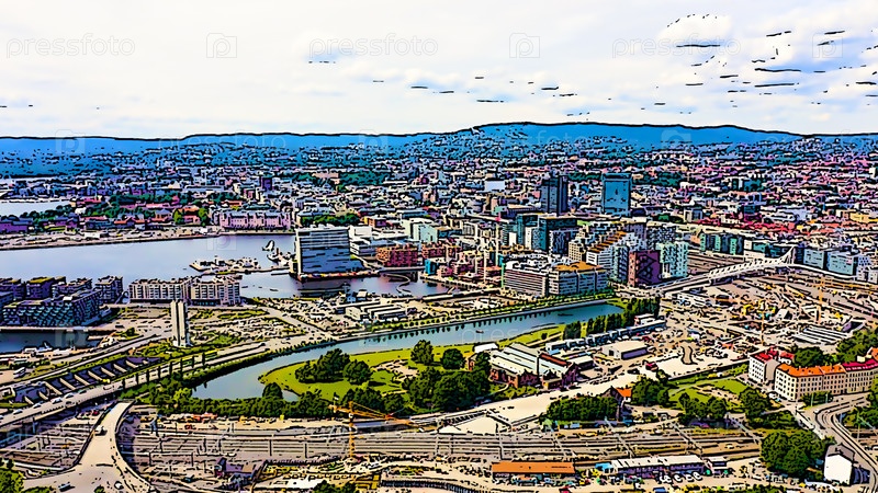 Осло, Норвегия. Центр города с воздуха. Набережная Осло-фьорда. Яркая иллюстрация в мультяшном стиле. С высоты птичьего полета