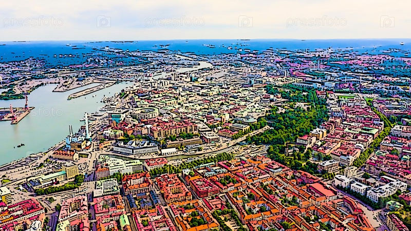 Гетеборг, Швеция. Панорама центральной части города. Облачная погода. Яркая иллюстрация в мультяшном стиле. С высоты птичьего полета