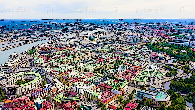 Гетеборг, Швеция. Панорама центральной части города. Облачная погода. Яркая иллюстрация в мультяшном стиле. С высоты птичьего полета