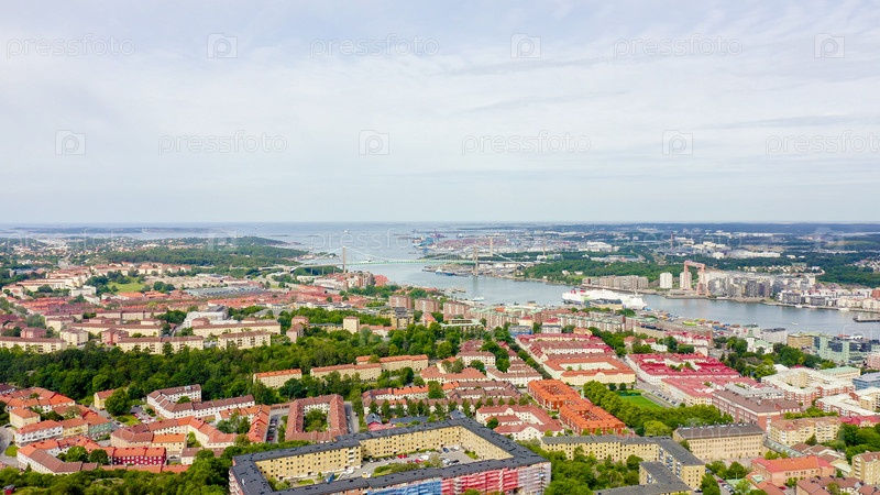 Гетеборг, Швеция. Альвсборгский мост. (Эльвсборгсбрунн) Панорама центральной части города. Пасмурная погода, С дрона