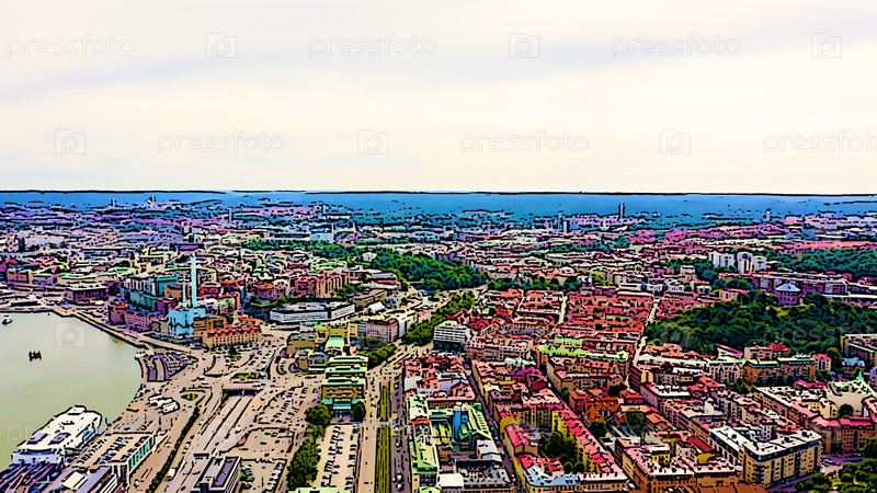 Гетеборг, Швеция. Панорама центральной части города. Облачная погода. Яркая иллюстрация в мультяшном стиле. С высоты птичьего полета