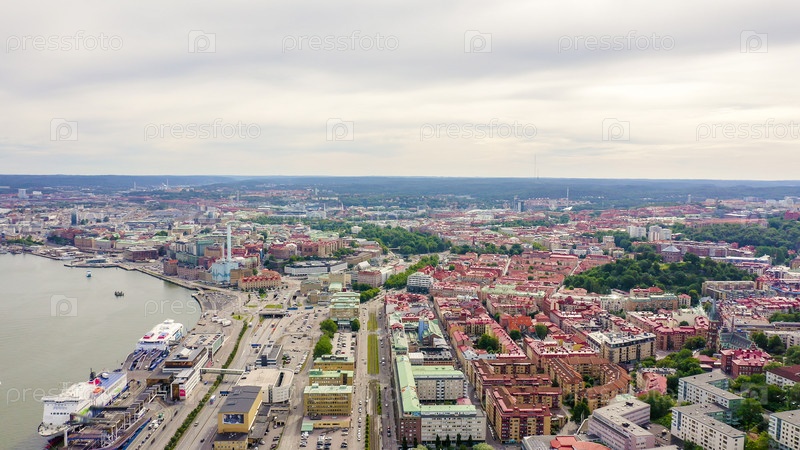 Гетеборг, Швеция. Панорама города и реки Гоэта Эльв. Исторический центр города. Пасмурная погода, С дрона