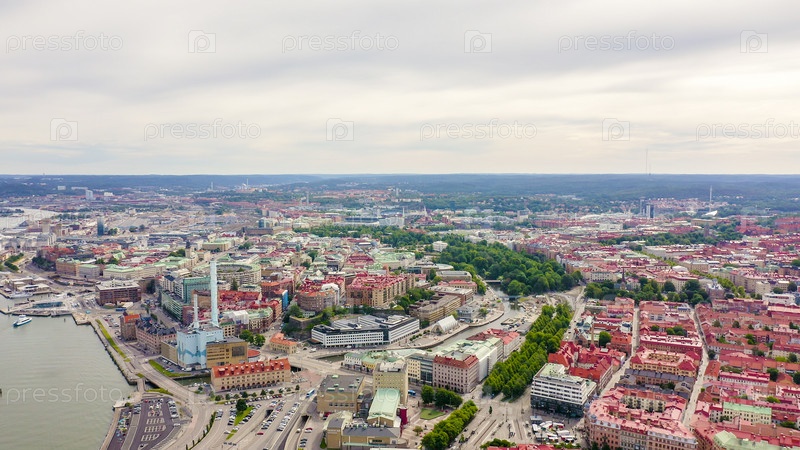 Гетеборг, Швеция. Панорама города и реки Гоэта Эльв. Исторический центр города. Пасмурная погода, С дрона