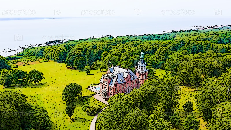 Швеция. Замок на берегу Эресуннского пролива. Яркая иллюстрация в мультяшном стиле. С высоты птичьего полета
