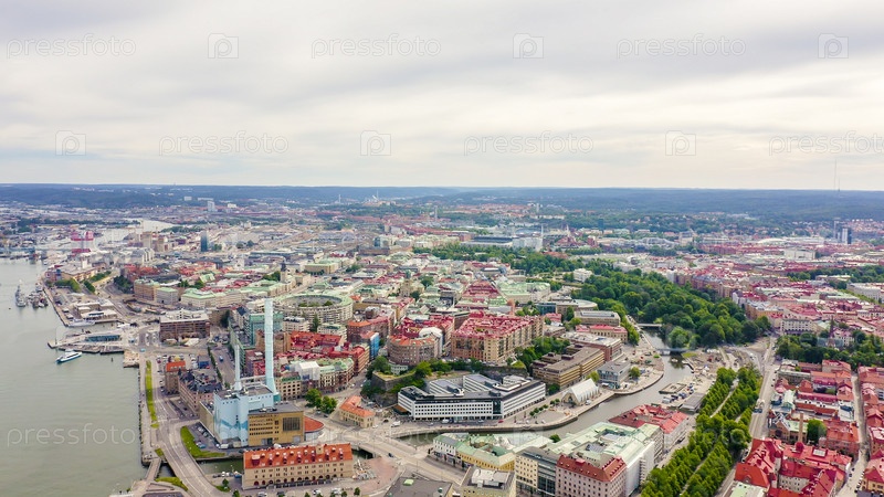 Гетеборг, Швеция. Панорама города и реки Гоэта Эльв. Исторический центр города. Пасмурная погода, С дрона