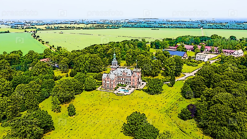 Швеция. Замок на берегу Эресуннского пролива. Яркая иллюстрация в мультяшном стиле. С высоты птичьего полета