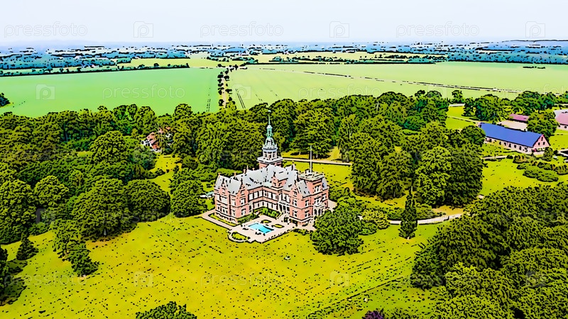 Швеция. Замок на берегу Эресуннского пролива. Яркая иллюстрация в мультяшном стиле. С высоты птичьего полета