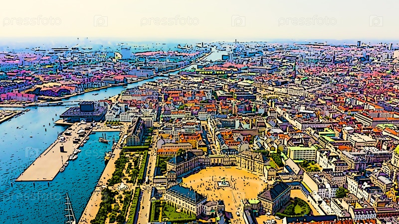 Копенгаген, Дания. Амалиенборг. Дворцовый комплекс XVIII века в стиле рококо. Яркая иллюстрация в мультфильмовом стиле. С высоты птичьего полета