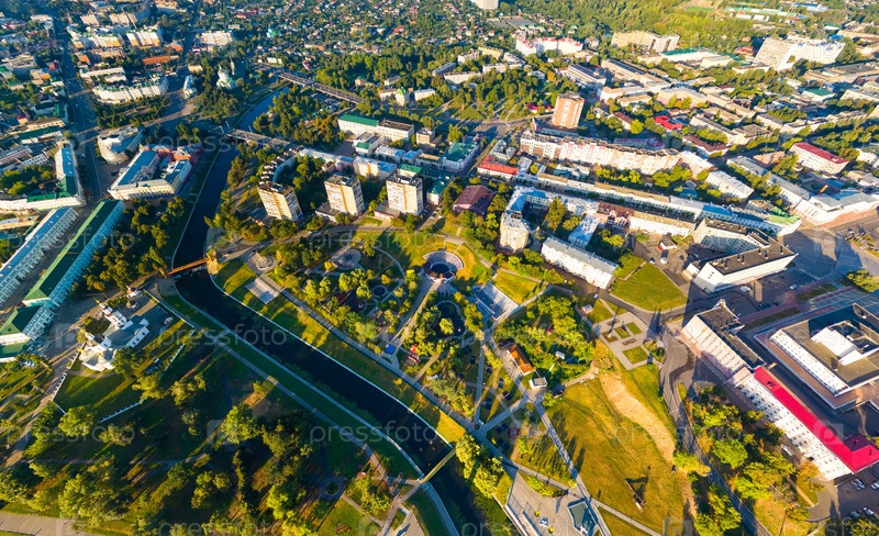Орел, Россия. Панорама центра города с воздуха утреннего времени. С высоты птичьего полета
