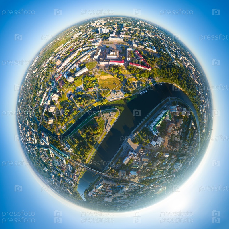 Орел, Россия. Панорама центра города с воздуха утреннего времени. 360-градусный панорамный астероид