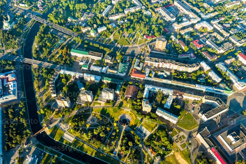 Орел, Россия. Панорама центра города с воздуха утреннего времени. С высоты птичьего полета