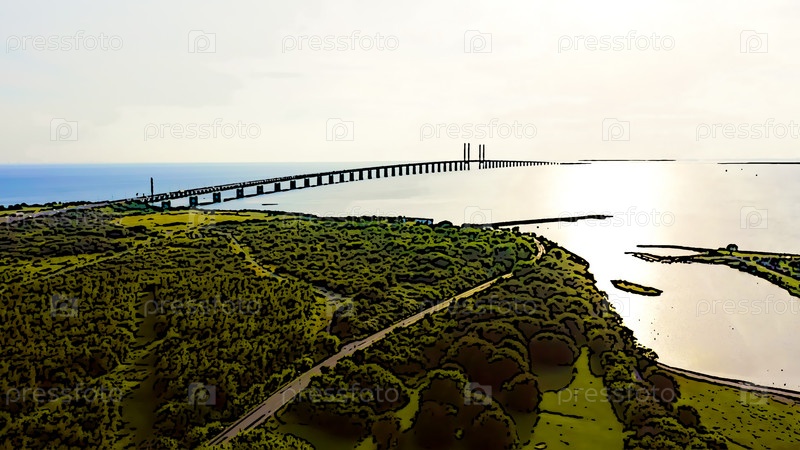 Мальме, Швеция. Эресуннский мост. Длинный туннельный мост с искусственным островом между Швецией и Данией. Яркая иллюстрация в мультяшном стиле. С высоты птичьего полета