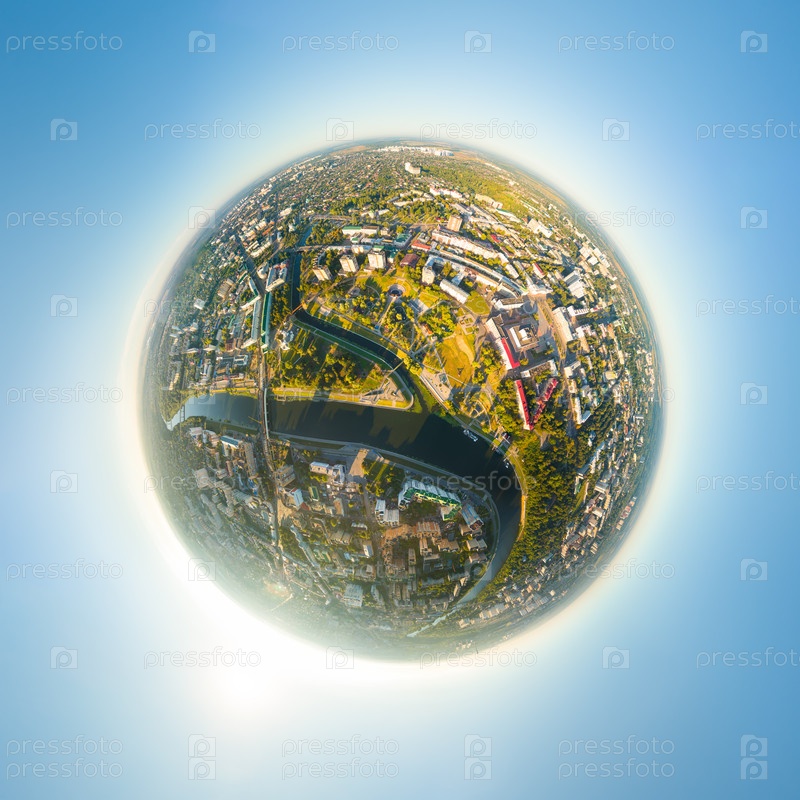 Орел, Россия. Панорама центра города с воздуха утреннего времени. 360-градусный панорамный астероид